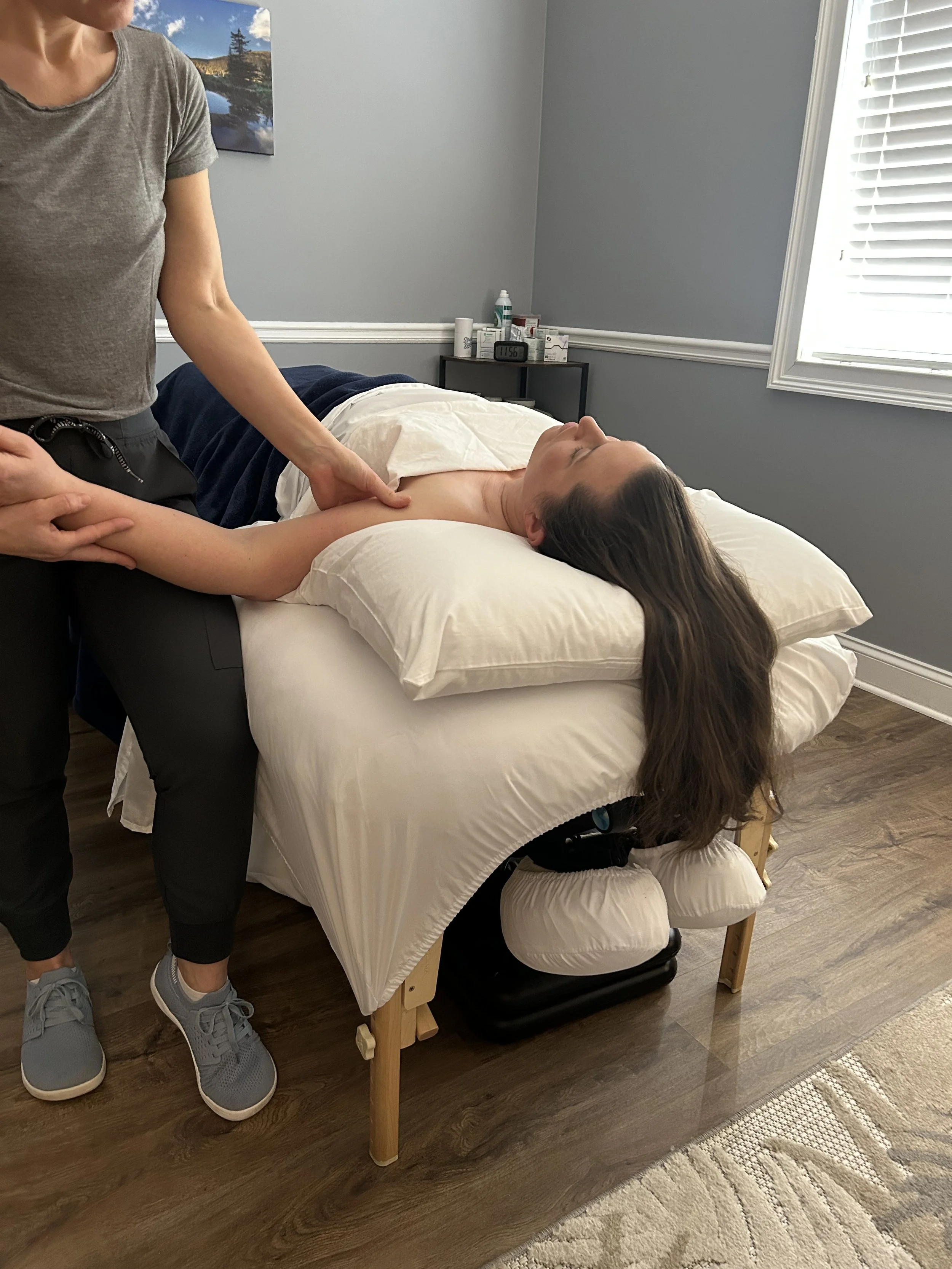 Lymphatic Drainage is not massage. It is specifically designed to stimulate the lymphatic system. During a session we will work on the head and neck, chest (not breast tissue), abdomen, and lymph nodes in the front hip crease (inguinal) and armpits (axillary). Arms and legs will be included in full body sessions or when the swelling/injury is in a limb. All sessions are performed without the use of oil or lotion.